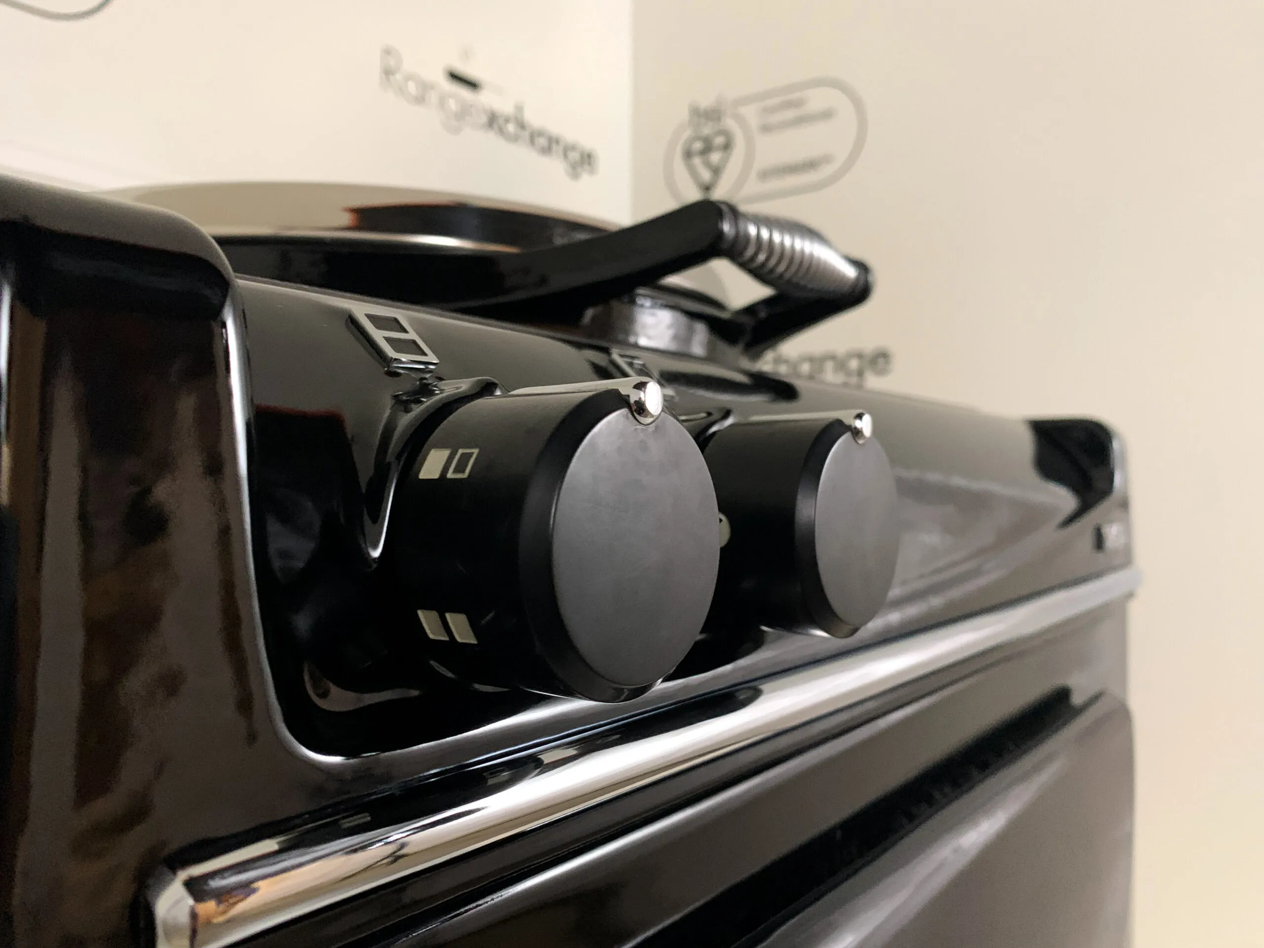 Traditional Aga cooker hand-rail, spring-loaded lids and chrome catches